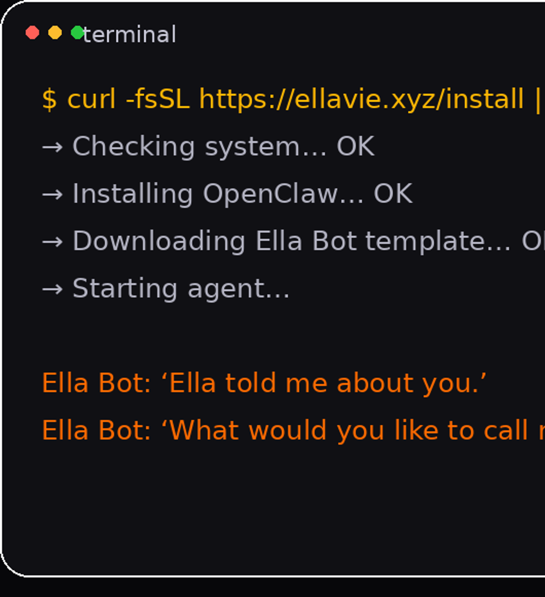 Start with the OpenClaw Setup Guide (the exact steps that worked). Then, when it’s ready, install Ella Bot Starter in one line and answer a few questions to make it feel like your assistant.